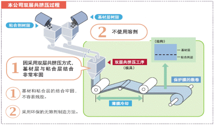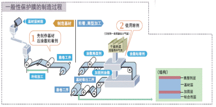 শিল্প আবরণ প্রতিরক্ষামূলক ফিল্ম একটি ফ্ল্যাট ফিল্ম এক্সট্রুশন মেশিন (এক্সট্রুশন) বা একটি ফিল্ম ব্লোয়িং মেশিন (ব্রাউজিং) দ্বারা তৈরি করা হয়, এবং তারপর একটি আবরণ পদ্ধতি (কোটিং) আঠালো উপাদান দিয়ে প্রলিপ্ত, অসুবিধা হল যে প্রক্রিয়ায় দ্রাবক ব্যবহার করা প্রয়োজন, সেকেন্ডারি প্রক্রিয়াকরণের প্রয়োজন এবং অবশিষ্ট আঠালো তৈরি করা সহজ এবং উচ্চ স্ট্যাটিক বিদ্যুৎ।